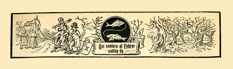 La representació del signe zodiacal de Peixos ocupa la part central del gravat, i l’escena del costat representa una de les tasques més importants del camp: la de podar les branques de les oliveres, les vinyes i desbrossar de matolls els boscos.