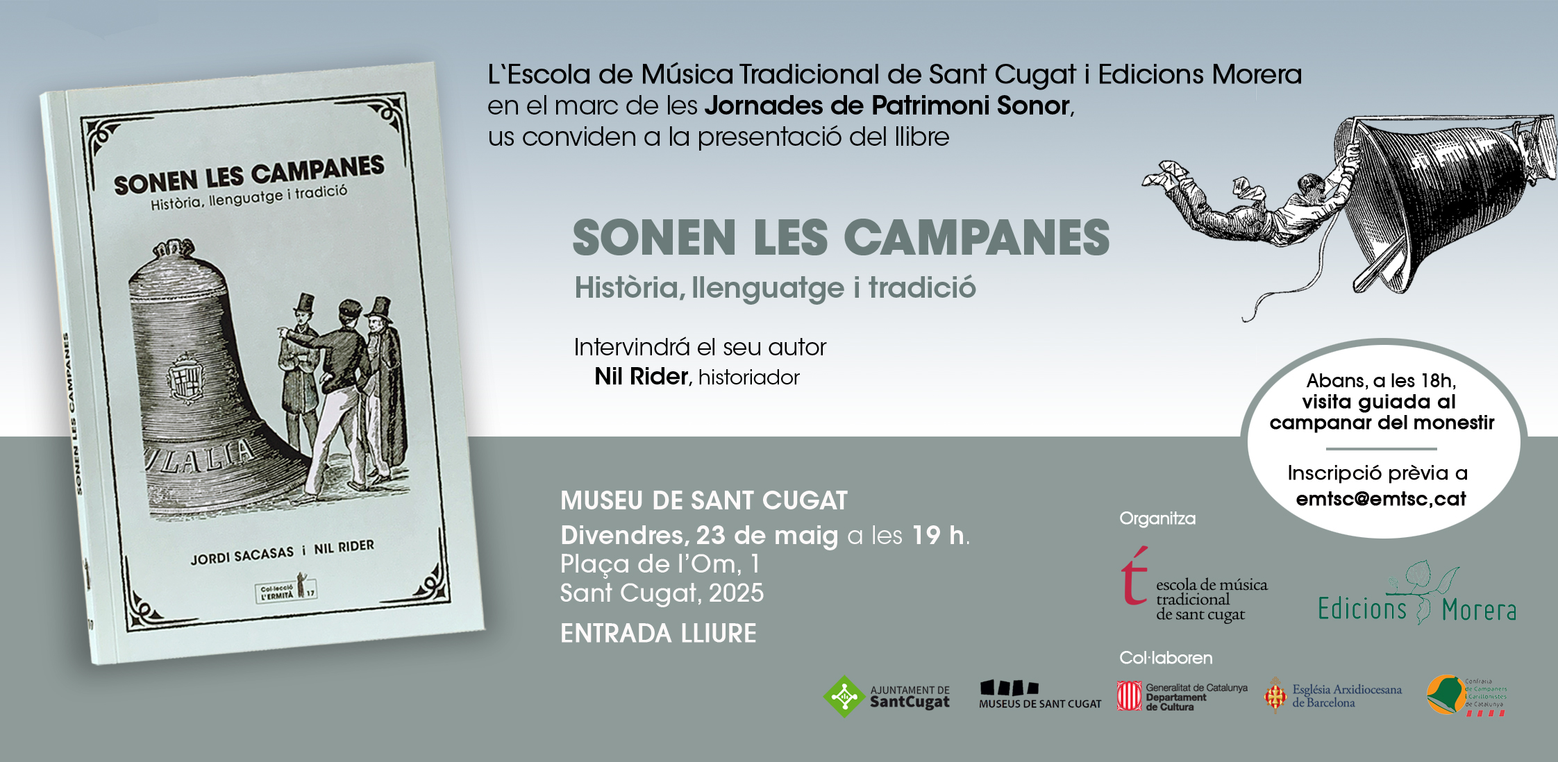 El proper divendres, 23 de maig el Museu de Sant Cugat del Vallès es presentarà el llibre Sonen les campanes. Història, llenguatge i tradició (Col·lecció Ermità núm. 17) escrit conjuntament per Jordi Sacasas, arxiver i conservador de Santa Maria del Pi, i l’historiador Nil Rider.