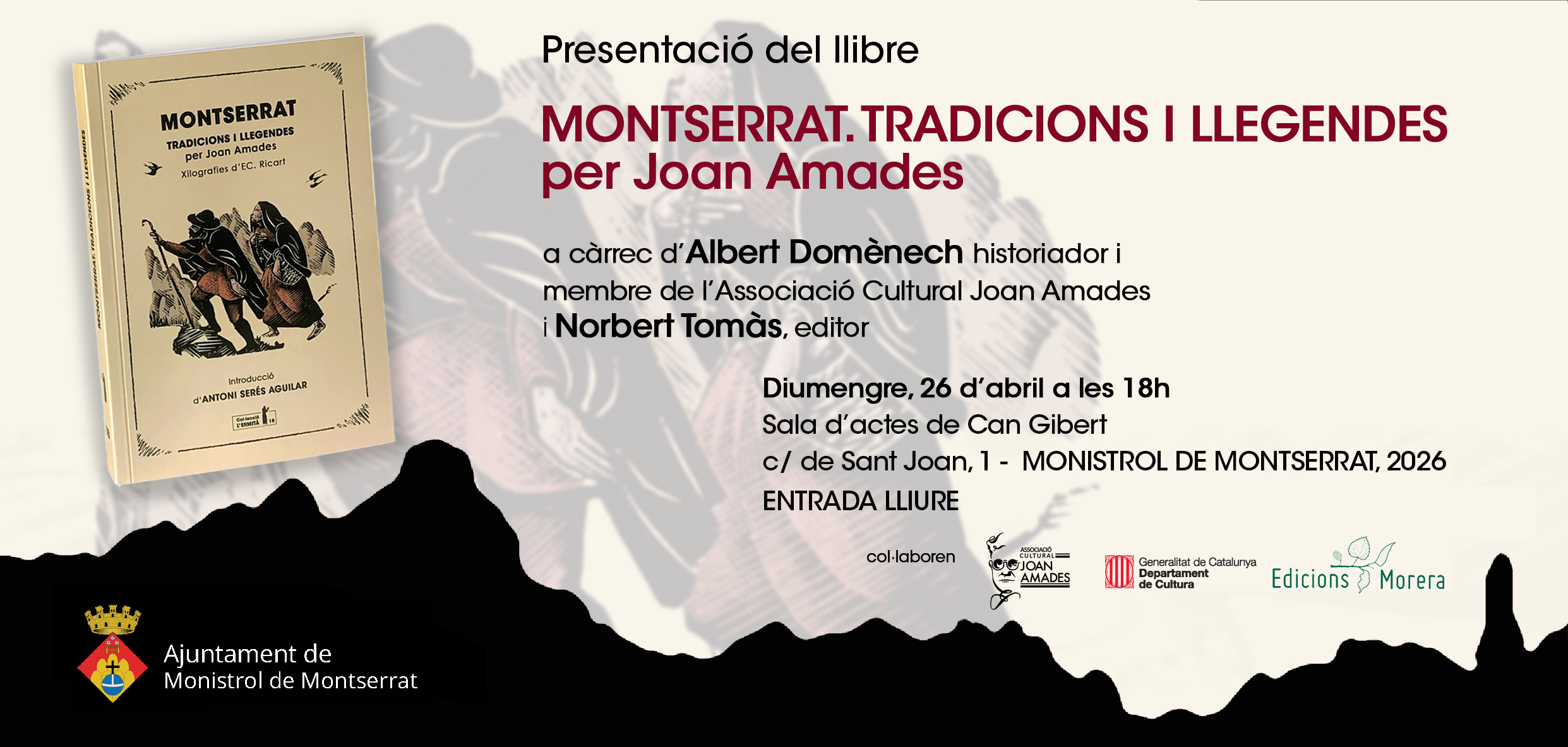 El pròxim diumenge 26 d’abril de 2026, Monistrol de Montserrat acollirà la presentació del llibre Montserrat. Tradicions i llegendes (Col·lecció l’Ermità núm. 18) del folklorista Joan Amades. L’acte, que anirà a càrrec de l’historiador Albert Domènech, membre de l’Associació Cultural Joan Amades, entitat encarregada de difondre el llegat del gran folklorista.