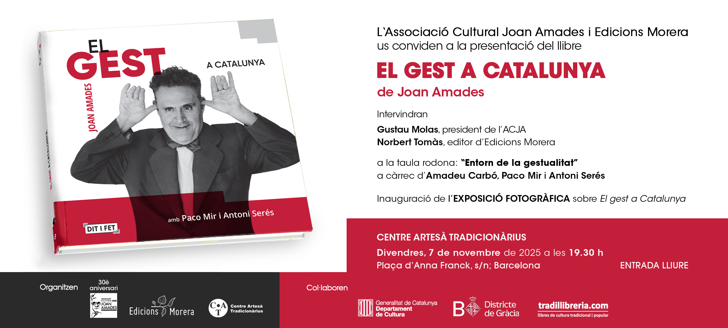 La presentació de El gest a Catalunya tindrà lloc divendres 7 de novembre, a les 19.30h, al Centre Artesà Tradicionàrius, al barri de Gràcia de Barcelona, en un acte que comptarà amb la presència dels diferents actors implicats en el projecte: el president de l’Associació Cultural Joan Amades, el director d’Edicions Morera i els autors dels textos introductoris, Paco Mir i Antoni Serés, tots ells acompanyats pel reconegut folklorista Amadeu Carbó.