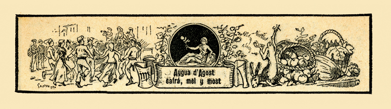 Aquesta imatge correspon a la sèrie de gravats recuperats de les capçaleres dels mesos del Calendari Català de l’any 1888, gravats per Castro a partir de dibuixos de Jaume Pahissa i Laporta (1846-1928). En la imatge que acompanya el mes d’agost es representa el ball d’una sardana i una cobla de músics. És una imatge insòlita i única en l’edició de capçaleres mensuals dels calendaris.