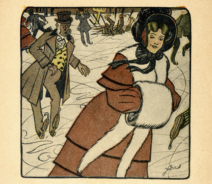 Antigament, l’escena tradicional del mes de gener, a més de l’al·legoria zodiacal d’Aquari, era la dels pagesos recollint llenya en un paisatge nevat o bé a l’interior de casa amb els pagesos asseguts a la vora del foc. Inglada opta per representar uns personatges de classe benestant que es permeten la pràctica d’una activitat lúdica a l’exterior com és el patinatge sobre gel, una escena poc comuna i que a més sorprèn per la latitud en què estem.