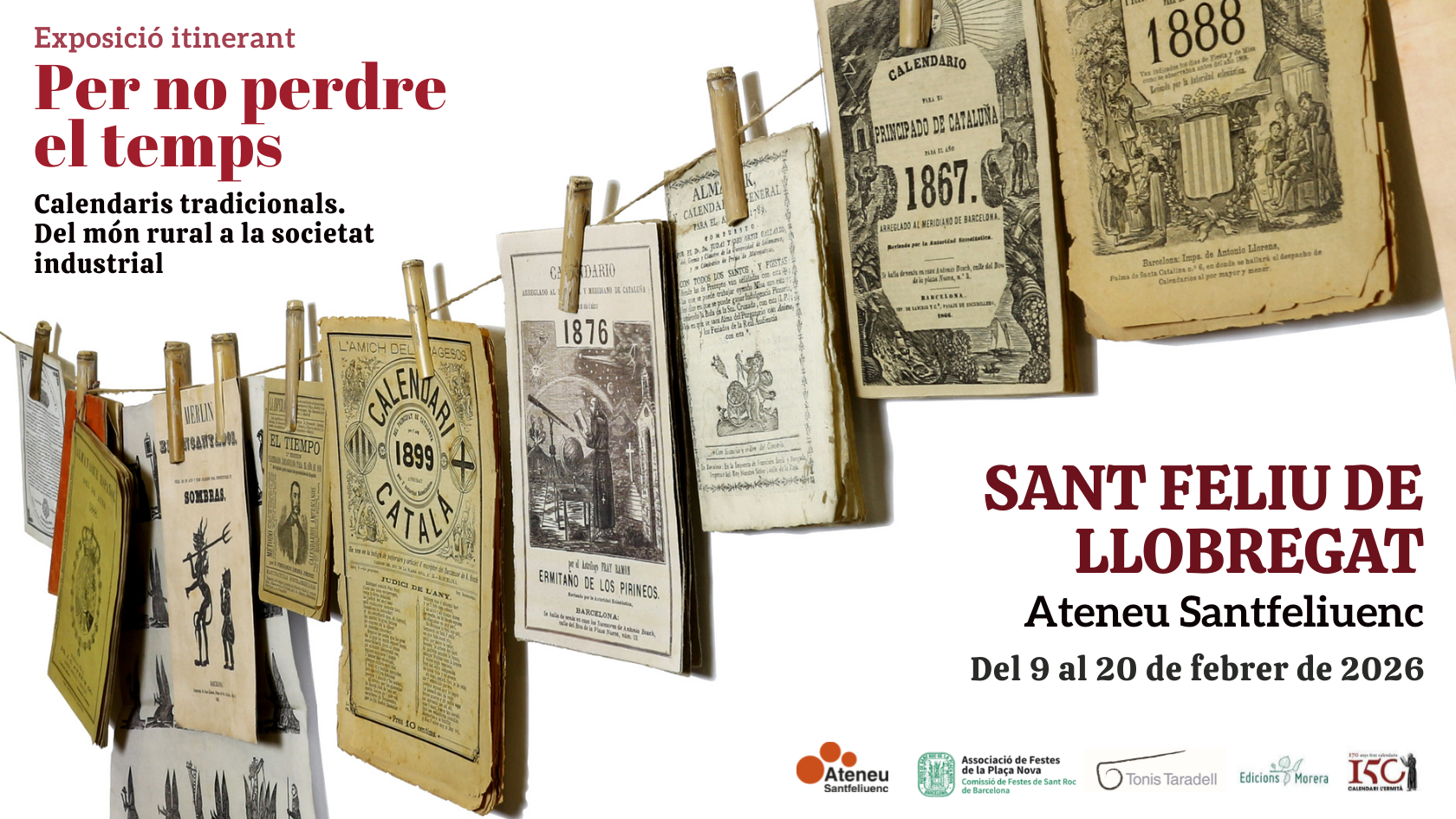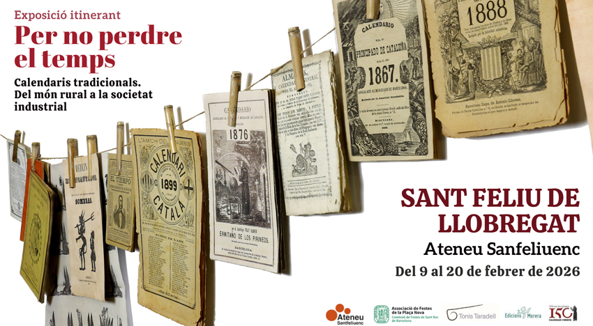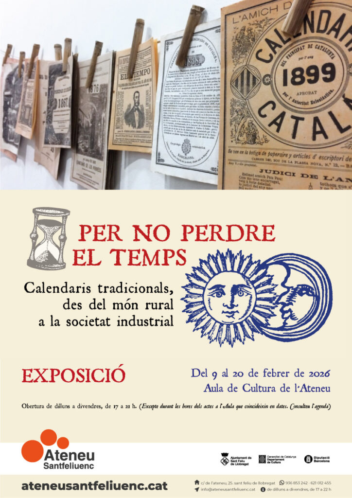 Cartell Expo Calendaris St. F.llobregatAquest 2026, l’exposició sobre calendaris tradicionals “Per no perdre el temps” segueix la seva itinerància per diferents localitats catalanes i del 9 al 20 de febrer es podrà visitar a l’Ateneu Santfeliuenc de Sant Feliu de Llobregat en el marc del seu programa d’activitats culturals del primer trimestre de l’any, on tenen cabuda jornades, xerrades, presentacions i exposicions.