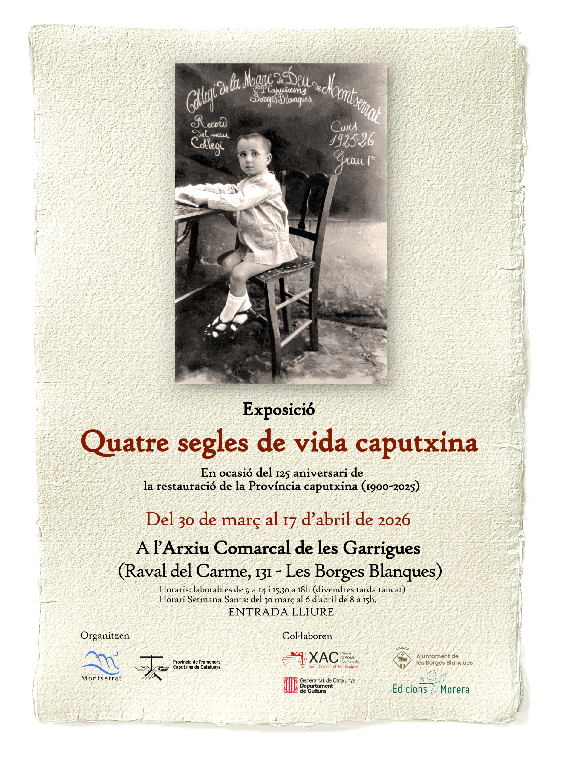 Produïda per Edicions Morera, que a més s’encarrega de la promoció, l’exposició a les Borges Blanques està organitzada per la Província de Framenors Caputxins de Catalunya i el Col·legi Mare de Déu de Montserrat, i compta amb la col·laboració del Departament de Cultura de Generalitat de Catalunya, l’Ajuntament de les Borges Blanques i del mateix Arxiu Comarcal de les Garrigues que l’acull.